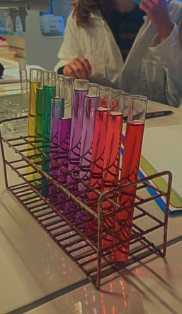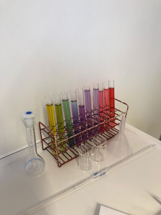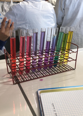 Photos d’un laboratoire réalisé avec les 5e Sciences de base sur la concentration, où ils ont créé un arc-en-ciel grâce à du jus de chou rouge et en faisant une succession de dilutions :